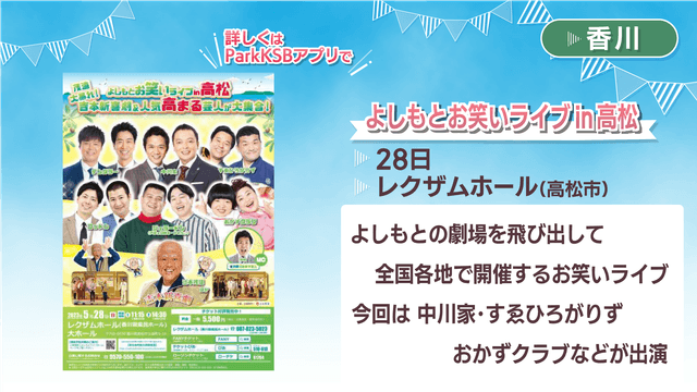 香川の1位は「よしもとお笑いライブin高松」です。よしもとの劇場を飛び出して、全国各地で開催しているよしもとお笑いライブ! 豪華出演者による漫才は、老若男女問わず楽しめます。今回は「中川家」や「すゑひろがりず」「おかずクラブ」などが出演します!