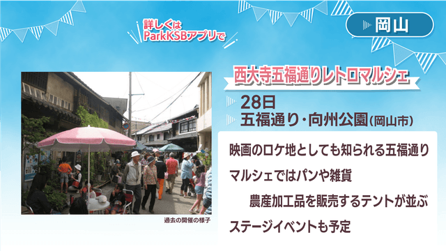 岡山の1位は、28日に岡山市東区の五福通りで行われる「レトロマルシェ」です。五福通りは「ALWAYS三丁目の夕日」や「魔女の宅急便」など映画のロケ地としても知られています。マルシェではパンや雑貨、地元の農産加工品を販売するテントが並ぶほか、ステージイベントも予定されています。