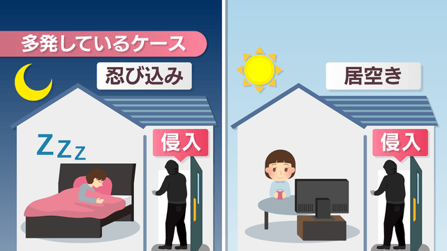 このうち寝ている間に侵入する「忍び込み」と家に住人がいる時に侵入する「居空き」が半数を占めています。