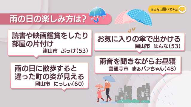 雨の日は好き?【みんなに聞いてみた】 2023/6/23 18:15 みんなに聞いてみた ADVERTISEMENT ADVERTISEMENT 23日は「ググッと。瀬戸内」のコーナーで雨でも楽しめるスポットをご紹介しましたが、Park KSBアプリでは皆さんに「雨の日が好きかどうか」を聞いてみました。 写真ページをみる