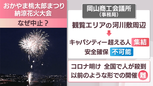 大会の事務局である岡山商工会議所によると、中止の主な理由は観覧エリアである河川敷周辺にキャパシティーを超える人が集まりすぎたため、安全を確保できないことです。