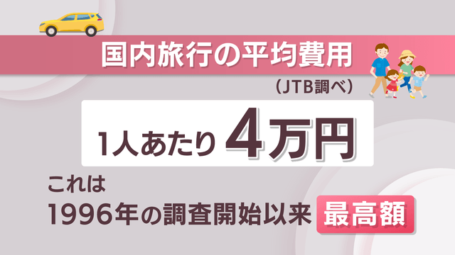 JTBの調査では、2023年の夏、1人あたりの国内旅行の平均費用は4万円と予測されています。これは物価高の影響などもあって1996年の調査開始以来、過去最高額です。