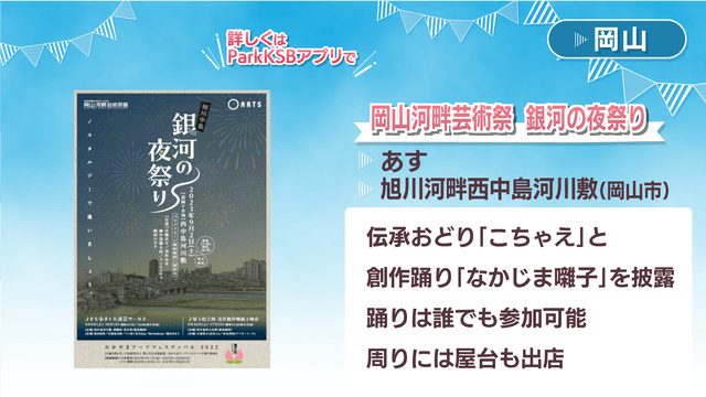 岡山の1位は9月2日、旭川の中州で行われる「岡山河畔芸術祭 銀河の夜祭り」です。伝承おどり「こちゃえ」と創作踊り「なかじま囃子」、新旧のおどりが披露されます。踊りには誰でも参加できるそうです。周りには屋台も出てお祭りムードを盛り上げます。