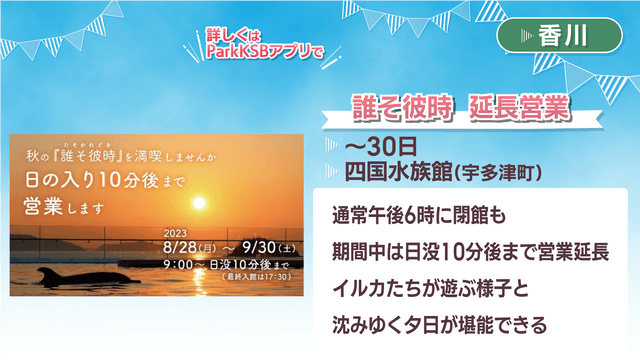 香川の1位は四国水族館で行われている「誰そ彼時 延長営業」です。四国水族館は通常午後6時に閉館しますが9月30日までは日没の10分後まで営業時間を延長しています。瀬戸内海が一望できるデッキでイルカたちが遊ぶ様子と沈みゆく夕日を堪能できます。ちなみに……9月1日の香川の日没は午後6時31分です。
