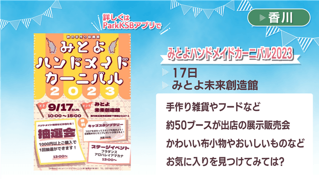 香川の1位は、17日に開かれる「みとよハンドメイドカーニバル」。手作り雑貨やフードなど、約50のブースが出店するハンドメイド作品の展示販売会。かわいい布小物や素敵なアクセサリー、おいしいものなど、お気に入りを見つけてみてはいかがでしょうか。