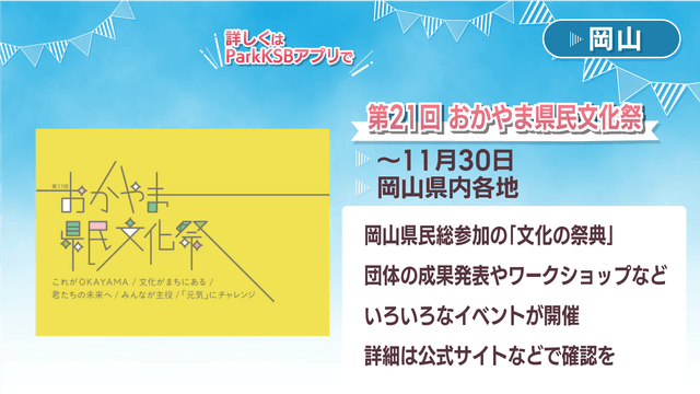 岡山の1位は、9月から11月にかけて開催されている文化の祭典「おかやま県民文化祭」です。文化団体などによる成果発表やワークショップなど、いろいろなイベントが行われています。ちなみに、この土日は、小学生バンドフェスティバルなどが予定されています。詳しくは「おかやま県民文化祭」の公式サイトをご確認ください。