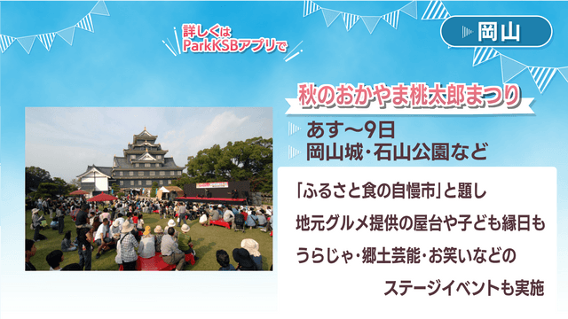 そして岡山の1位は、この3連休に岡山城などで行われる「秋のおかやま桃太郎まつり」です。「ふるさと食の自慢市」と題して、地元グルメを提供する屋台や子ども縁日が並びます。