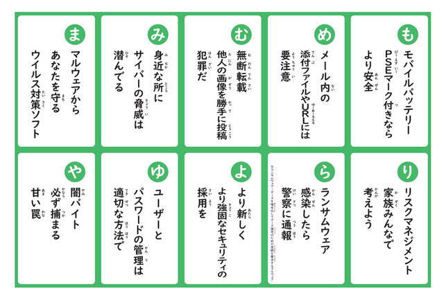 など、最近増えている犯罪手口なども盛り込んでいます。サイバー犯罪に関する専門的な用語は、読み札側で詳しく説明しています。