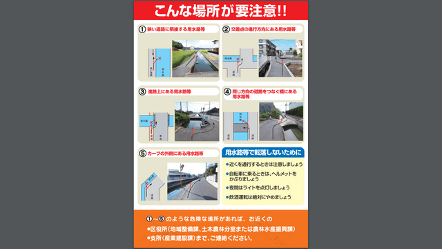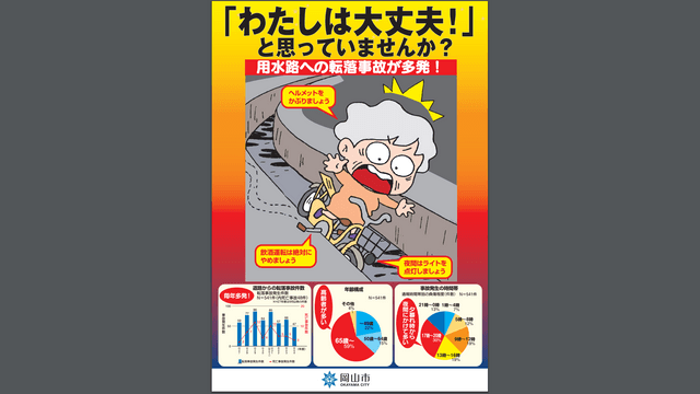 岡山市は、用水路に転落しないよう、近くを通行するときには注意を払うこと、自転車に乗るときにはヘルメットをかぶること、夜間にはライトを点灯することなどを記載した啓発チラシを作成。各区役所や支所、公民館など合わせて59カ所に置くということです。