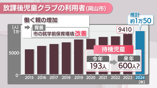 放課後児童クラブをめぐってはニーズがさらに高まるという推計もあります。岡山市は、2024年度の申込数が2023年度より600人以上多い1万50人になると推計しています。