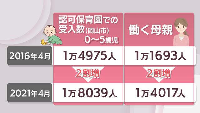 岡山市の認可保育園に通う園児は子どもの受け入れ数は2016年から2021年にかけて2割増えました。(2016年4月:1万4975人⇒2021年4月:1万8039人)