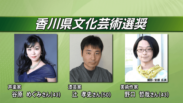 また、顕著な功績をあげた個人や団体に贈られる「香川県文化芸術選奨」は、声楽家の谷原めぐみさんら3人が選ばれました。