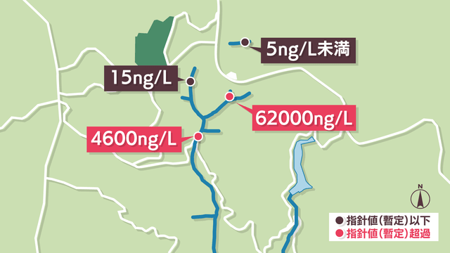 調査した中で最も上流にある沢では、暫定目標値の1240倍にあたる1Lあたり6万2000ngが検出されました。最も高濃度を検出した沢から100mから200m北の地点には……。