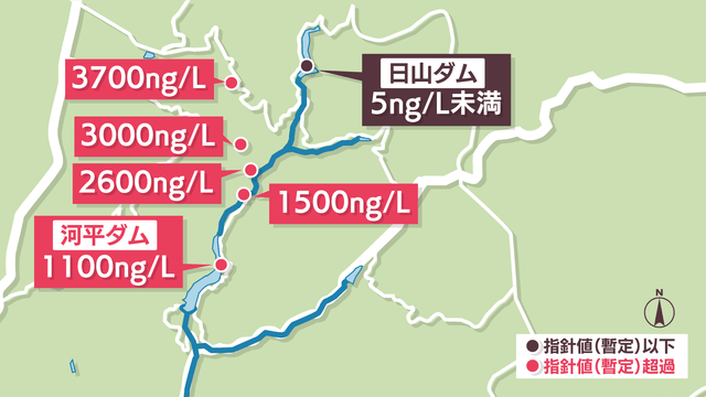 調査の結果、新たな水源とした日山ダムの値は低かったものの、22地点中12地点で暫定目標値を超え、上流に行くほどその値が高くなりました。