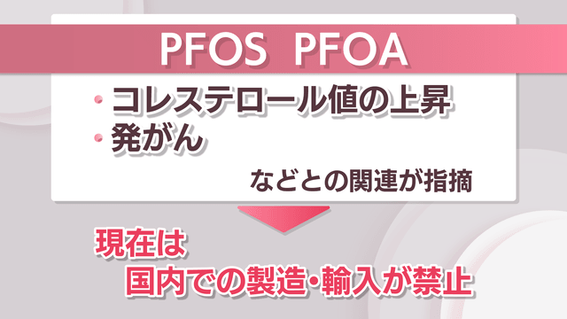 「PFOS」と「PFOA」は、コレステロール値の上昇や、発がんとの関連などが指摘されています。以前は消火剤や界面活性剤など、幅広く使われていましたが、現在は国内での製造や輸入が禁止されています。
