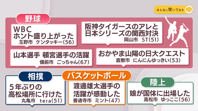 今年最も注目した・熱くなったスポーツは?【みんなに聞いてみた】 2023/12/11 18:15 みんなに聞いてみた ADVERTISEMENT ADVERTISEMENT 11日も野球・サッカー・バスケなど様々なスポーツの話題をお伝えしましたが、Park KSBアプリでは皆さんに「今年最も注目した熱くなったスポーツ」を聞いてみました。 写真ページをみる