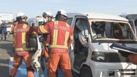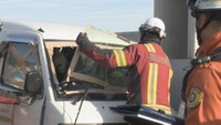 渋滞中の車にタンクローリーが衝突した想定の訓練 岡山市消防教育訓練センター