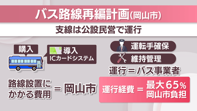 これは新たな車両の購入やICカードシステムの導入など主に路線の設置にかかる費用は岡山市が負担し、運転手の確保や車両の維持管理などの実際の運行はバス事業者が担うというものです。