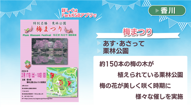 そして香川の3位は「栗林公園の梅まつり」。約150本の梅の木が植えられている栗林公園。見頃の時期には鮮やかな色彩と香りで見る人を楽しませてくれます。梅の花が美しく咲く時期に、17日・18日と園内でさまざまな催しが行われます。