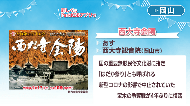 そして岡山の2位は、17日、西大寺観音院で行われる「西大寺会陽」。「はだか祭り」とも呼ばれ国の重要無形民俗文化財に指定されている西大寺会陽。新型コロナの影響で中止となっていた宝木の争奪戦が2024年は4年ぶりに復活します!