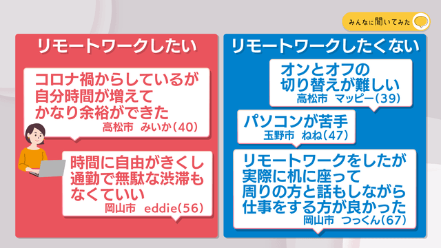 リモートワークしたことある?【みんなに聞いてみた】 2024/2/27 17:30 みんなに聞いてみた ADVERTISEMENT ADVERTISEMENT 27日は琴平町にリモートワークの人を対象とした新しい施設ができる、という話題をお伝えしましたが、Park KSBアプリでは皆さんが「リモートワークをしたことがあるか」を聞いてみました。 写真ページをみる