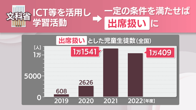 文科省によると、こうした形で「出席扱い」となった全国の児童・生徒の数は、コロナ禍の2021年度に大幅に増加しました。