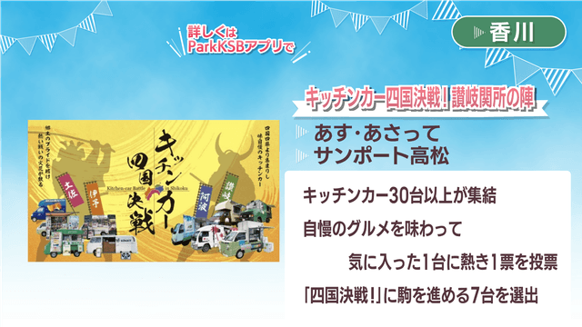 自慢のグルメを味わって、気に入った1台に熱き1票を投票してください! のちに開催される「四国決戦!」へ駒を進める7台が選ばれます!