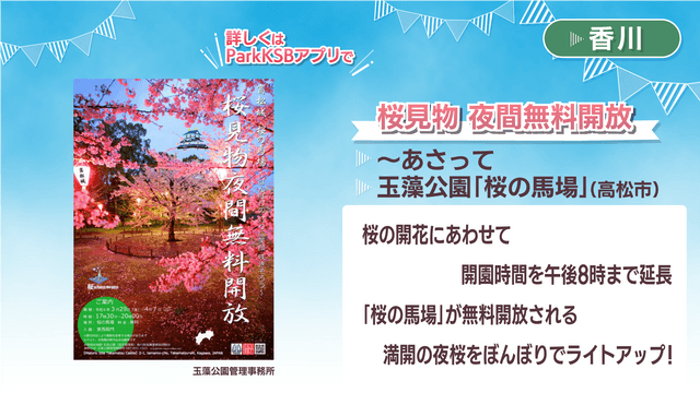 香川で1位になったのは…7日まで高松市の玉藻公園で開かれている「桜見物夜間無料開放」です!玉藻公園では桜の開花にあわせて開園時間が午後8時まで延長され、「桜の馬場」が無料開放されます。