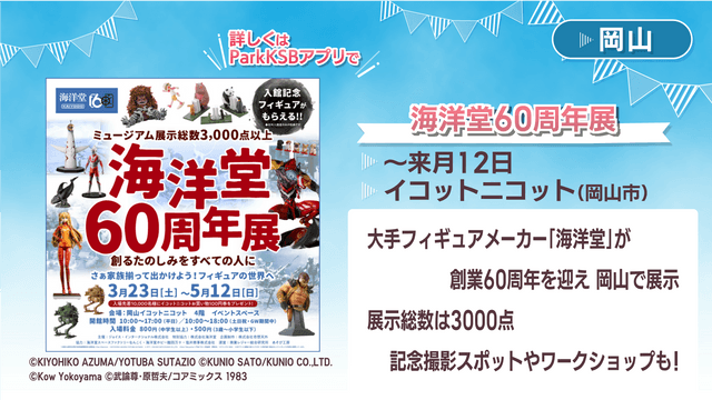 岡山の2位は、5月12日まで岡山市北区のイコットニコットで開かれている「海洋堂60周年展」です。大手フィギュアメーカー「海洋堂」が創業60周年を迎え、岡山で展示を行います!