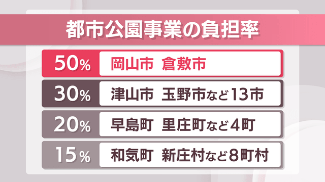 岡山県は、都市公園事業について各市町村に負担金を求める条例を定めていて、岡山市の負担割合は50%です。