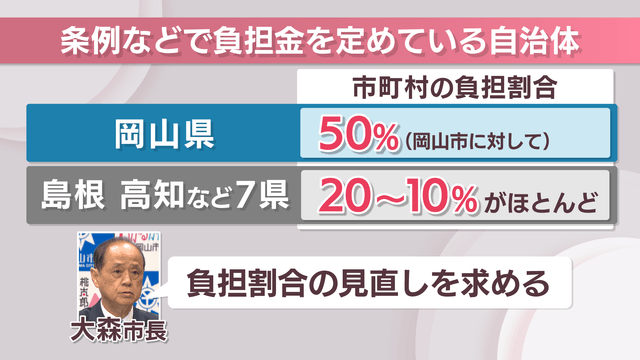 岡山市のまとめによりますと、条例などで負担金を定めているのは岡山県の他に7県あり、市町村の負担はほとんどが20%から10%になっています。