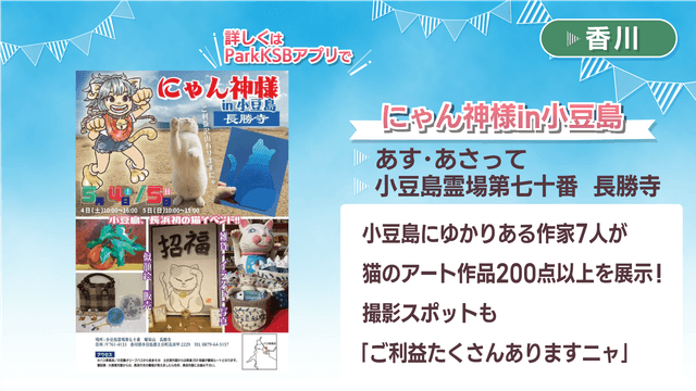 香川の1位は、小豆島霊場・第七十番札所長勝寺で4日と5日開かれる「にゃん神様in小豆島」です。小豆島にゆかりのある作家7人による猫のアート作品が200点以上展示されるということです。会場には、猫になりきれるような撮影スポットがあるということです。「ご利益たくさんありますニャ」な場所だそうです。