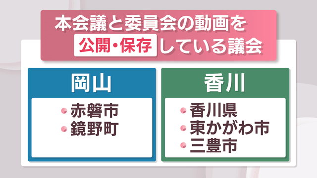 本会議と委員会の両方の動画を公開・保存しているのは岡山県では赤磐市と鏡野町のみ。