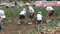 小学生がタマネギの収穫体験