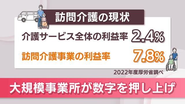 厚生労働省の2022年度の調査によると、介護サービス全体の利益率が2.4%なのに対し、「訪問介護事業」の利益率は7.8%で、入所施設など他のサービスより高くなっています。