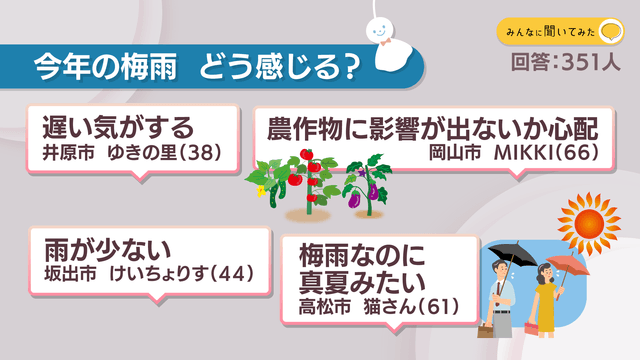 梅雨 どんなイメージ?【みんなに聞いてみた】 2024/6/19 17:30 みんなに聞いてみた ADVERTISEMENT ADVERTISEMENT 19日は「みんなのハテナ」で梅雨の時期に楽しめるアジサイの話題をお伝えしました。Park KSBアプリでは皆さんに「梅雨」といえばどんなイメージがあるか聞いてみました。 写真ページをみる