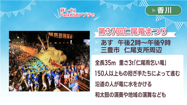 香川県の1位はこちらのイベント。三豊市仁尾町で3日開かれる「仁尾竜まつり」です。全長35m、重さ3tもある「仁尾雨乞い竜」が、150人以上もの担ぎ手たちの手によって地域を回る姿は迫力満点です。また、沿道の人が雨乞いの願いをこめて竜に水をかける様子も特徴的ですよ。この祭りは三豊市の仁尾支所周辺で、3日午後2時から午後9時まで開かれます。