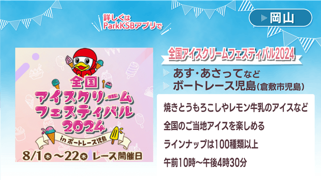 岡山の1位は全国から集まった100種類以上のアイスを楽しめるイベントです。北海道からは焼きとうもろこし風味のアイスや、栃木県からは「レモン牛乳」風味のアイスなど、ご当地ならではの冷たいスイーツを買うことができます。倉敷市のボートレース児島にある特設会場で、4日午後4時30分まで開かれています。もしこの週末行けなくても翌週以降に開かれている日もあります。