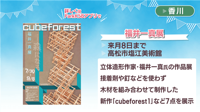 香川県の2位は、高松市塩江美術館で開かれている立体造形作家・福井一真さんの展覧会です。接着剤や釘などを使わずに木材を組み合わせた「四方十字組手」という手法で制作した新作など立体作品を7点ほど展示しています。