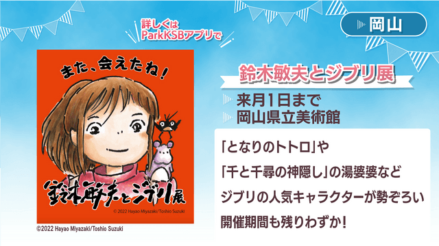 岡山県の1位は、岡山市の岡山県立美術館で開かれている「鈴木敏夫とジブリ展」です。会場では「となりのトトロ」や「千と千尋の神隠し」の湯婆婆などジブリ作品の人気キャラクターや有名な台詞をバックに写真を撮ることができます。多くの名作を世に送り出したスタジオジブリのプロデューサー鈴木敏夫さんの歩みを通してジブリ作品の魅力を伝えるこの特別展もいよいよあと1週間ほど。是非足を運んでみてください。