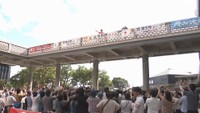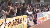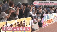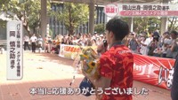 岡山県庁に集まった人たちに応える岡慎之助選手