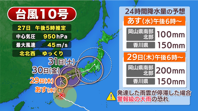 台風が近づく前から雨風が強まりそうです。予想される降水量はいずれも多いところで、28日午後6時からの24時間で岡山県では100ミリ、香川県では150ミリ。29日(木)の午後6時からの24時間で岡山県では200ミリ、香川県では150ミリとなっています。