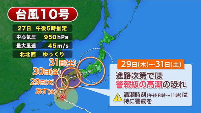 また、29日(木)から31日(土)にかけては警報級の高潮の恐れがあります。午後8時から11時ごろに満潮時刻を迎える日が多くなりますので、台風の接近と重なる場合は特に警戒してください。