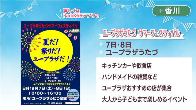 香川県の1位は香川県宇多津町の「ユープラザうたづ サマーフェスティバル」です。ユープラザうたづにキッチンカーや飲食店、ハンドメイドの雑貨などユープラザがおすすめの店が集まります。