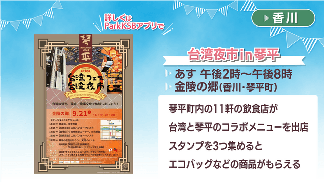 香川県の1位は21日、香川県琴平町の「金陵の郷」で行われる「台湾夜市in琴平」です。町内の11軒の飲食店が台湾と琴平のコラボメニューを出店。スタンプラリーも行っていてスタンプを3つ集めるとエコバッグなどの商品がもらえるということです。そのほか伝統的な弦楽器「二胡」の演奏もあり、台湾の味と文化を楽しめます。