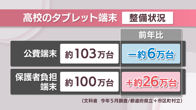 都道府県立と市区町村立の高校をあわせた端末の「台数」をみると、公費負担の端末が前の年よりも約6万台減ったのに対し、保護者負担のものは約26万台増えました。