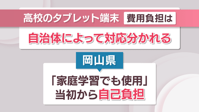 高校のタブレット端末の費用負担、実は自治体によって対応が分かれています。 岡山県は、「家庭学習でも使用するため」として、導入当初から自己負担としています。