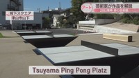 イタリア出身のアーティスト、ジャコモ・ザガネッリさんがデザインし、津山市の職人が制作した「Tsuyama Ping Pong Platz」