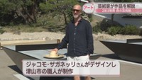 • イタリア出身のアーティスト、ジャコモ・ザガネッリさんがデザインし、津山市の職人が制作した「Tsuyama Ping Pong Platz」