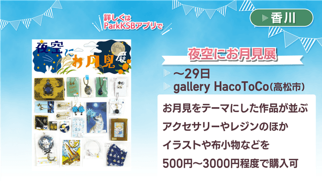 香川県の1位は、夜空や星、月といったテーマのハンドメイド作品が並ぶ「夜空にお月見展」です。まだ暑い日は多いですが、秋の訪れが見えてきました。秋といえば「お月見」ということで、お月見に関連したアクセサリーやレジン作品のほか、イラストや布小物を、500円から3000円程度で買うことができます。29日まで開かれています。